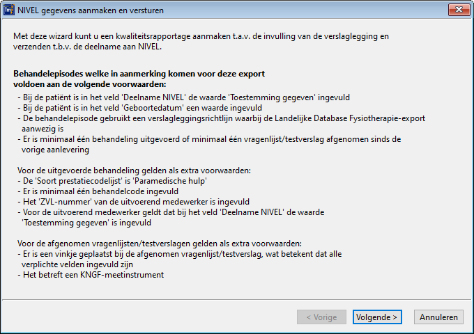 - Op de tweede pagina van de wizard zie je de voorwaarden waaronder behandelepisodes in aanmerking komen voor export:
