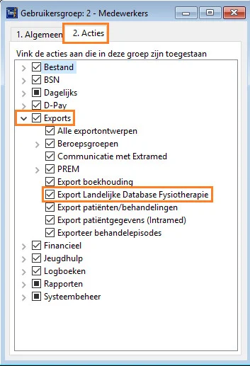 - Vink de groepsrechten aan / uit voor het uitvoeren van de actie “Export Landelijke Database Fysiotherapie”.