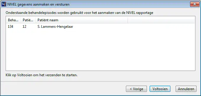 Dit zijn alle behandelepisodes die zijn gewijzigd sinds de laatste export. Een behandelepisode wordt gekenmerkt als gewijzigd, als een behandeling is toegevoegd of als de behandeldatum, behandelcode of een veld in de verslaglegging is gewijzigd. - Klik op “Voltooien” om de informatie te verzenden.