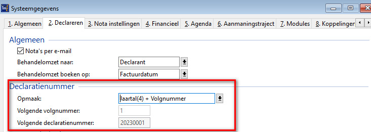 Je kunt daarvoor naar [Systeem], [Organisatie], [Systeemgegevens] tabblad “2. Declareren”. Kies vervolgens bij “Declaratienummer” voor de opmaak die gewenst is. Je kunt de volledige uitleg vinden in de online help.