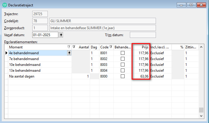 Mocht je al behandelseries met zorgproducten hebben aangemaakt met een startdatum na 01-01-2025, dan moet je de prijzen in de betreffende behandelserie handmatig aanpassen op tabblad 5 declaratietraject.