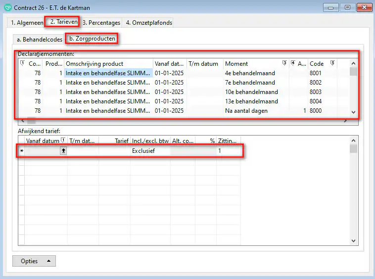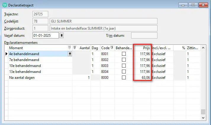 Mocht je al behandelseries met zorgproducten hebben aangemaakt met een startdatum na 01-01-2025, dan moet je de prijzen in de betreffende behandelserie handmatig aanpassen op tabblad 5 declaratietraject.