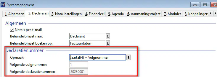 Je gaat daarvoor naar [Systeem], [Organisatie], [Systeemgegevens] tabblad “2. Declareren”. Kies vervolgens bij “Declaratienummer” voor de opmaak die gewenst is. Je kunt de volledige uitleg vinden in de online help.