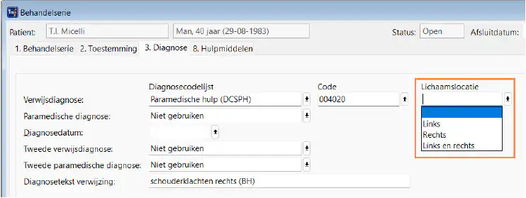 Omdat deze meegestuurd moet worden in de declaratie, kun je de lichaamslocatie voortaan vastleggen in een behandelserie. Daarom is in behandelseries met de verwijsdiagnose ‘Paramedische hulp (DCSPH)’ op tabblad ‘3. Diagnose’ een extra veld in te vullen:
