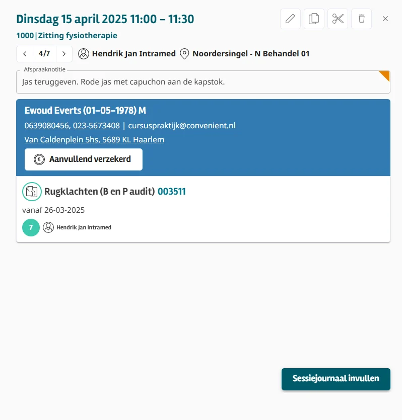 Je kunt vanuit de afspraakdetails snel naar het invullen van het sessiejournaal. Ook kun je gemakkelijk naar de volgende of vorige afspraak bladeren via de vorige en volgende knop bovenaan de afspraakdetails. Op je mobiel zijn deze knoppen niet zichtbaar, daar kun je swipen.