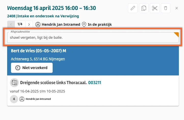 Je kunt een notitie bij een afspraak maken. Dit kan tijdens het maken van de afspraak of in de afspraakdetails. In de agenda kun je zien welke afspraken een afspraaknotitie hebben aan de oranje indicatie. Dit kun je goed gebruiken voor notities die te maken hebben met die afspraak. Je hoeft er dan geen notitie naast te zetten die ook weer ruimte in beslag neemt.