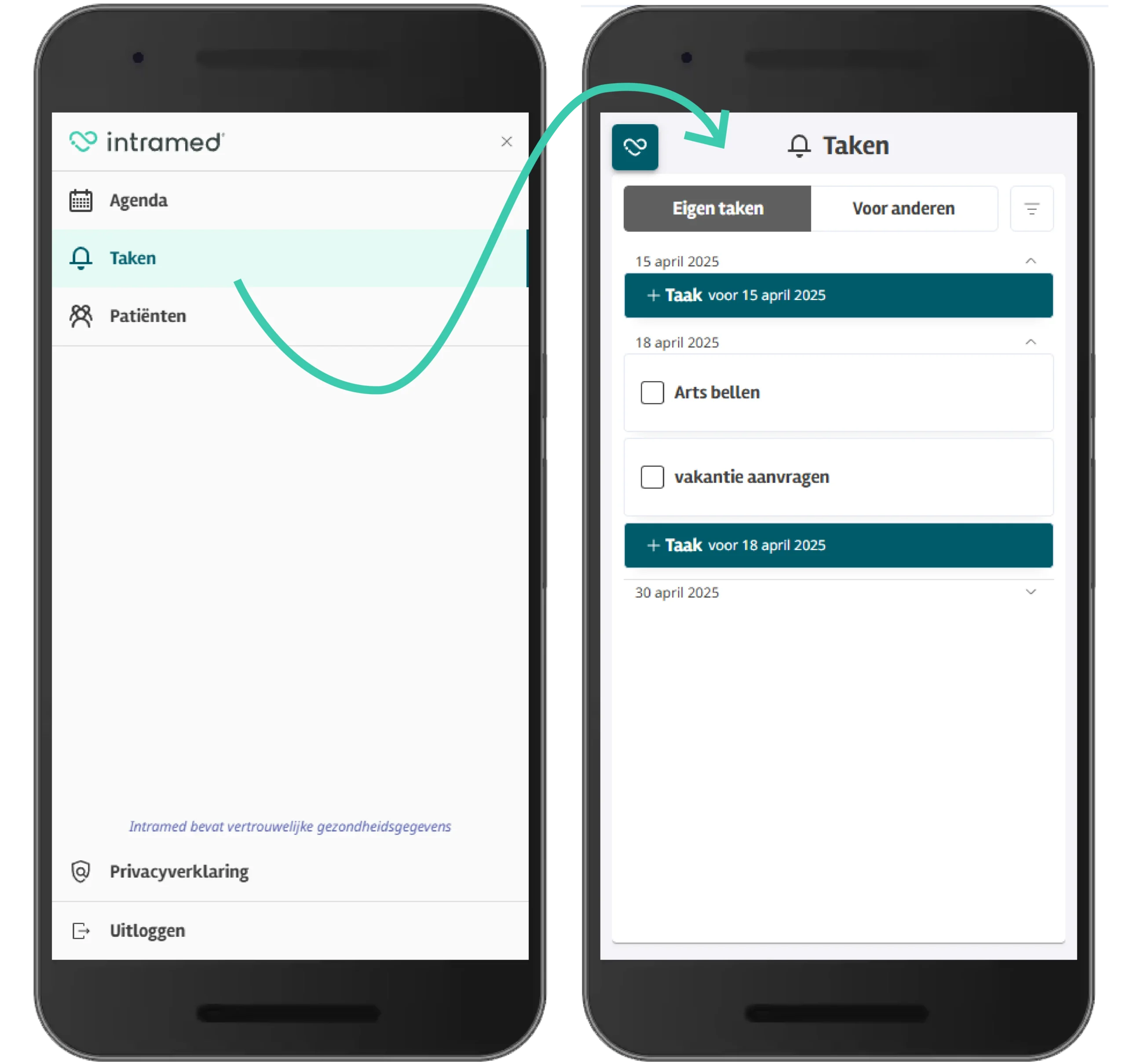 In Intramed Web kun je een taak voor een andere medewerker aanmaken. Ook kunnen andere medewerkers taken op jouw takenlijst zetten. Je kunt bij een taak aangeven of alle medewerkers de taak moeten uitvoeren of maar één van de geselecteerde medewerkers. De taken die jij moet uitvoeren, vind je bij ‘Eigen taken’ en taken die je hebt gemaakt voor anderen, maar die jij niet zelf hoeft uit te voeren, vind je bij ‘Voor anderen’. Je kunt alleen je eigen taken afronden. Bij een taak voor meerdere medewerkers kun je zien wie de taak al heeft afgerond.