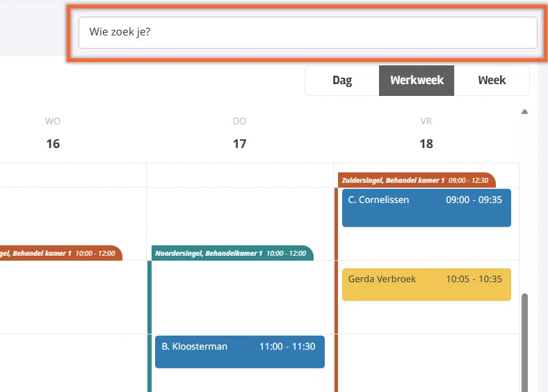 Bij het maken van een afspraak is het belangrijk dat je de juiste patiënt en het juiste behandeltraject selecteert. Zoek eerst de patiënt op via de zoekbalk door de achternaam of geboortedatum in te typen. Klik op de patiënt en je komt in een overzichtsscherm waar de behandeltrajecten staan. Klik op het kalender icoon aan de rechterzijde van een behandeltraject om voor dit traject een afspraak in te plannen. Je gaat nu terug naar de agenda en zodra je op een tijdstop klikt kan je de verdere afspraakdetails invullen. De patiënt en trajectgegevens zijn nu automatisch overgenomen.