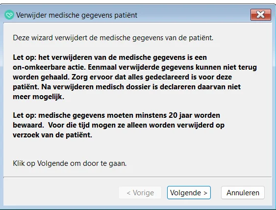• een patiënt verzoekt om verwijdering van alle gegevens (wat alleen kan als onder andere aan alle bewaartermijnen is voldaan).