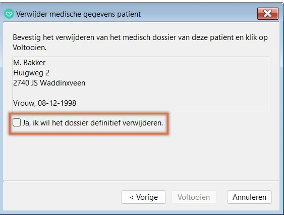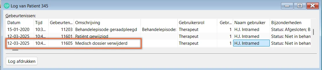 Na het verwijderen is er een logregel toegevoegd waarin staat, wanneer het medisch dossier is verwijderd en door wie.