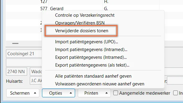 In de patiëntenlijst, onder de knop “Opties”, is de optie “Verwijderde dossiers tonen” zichtbaar.