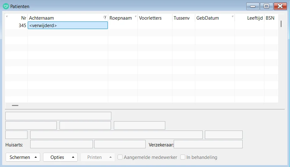Je ziet hier dat algemene patiëntgegevens bewaard zijn gebleven (zie ook de inleiding van deze beschrijving). Je kunt nog dubbelklikken op een patiënt in deze lijst. In deze situatie kun je in de patiëntenlijst geen nieuwe patiënt toevoegen. Ook vanuit de patiëntgegevens met verwijderde medische gegevens kan dan geen nieuwe patiënt worden toegevoegd.