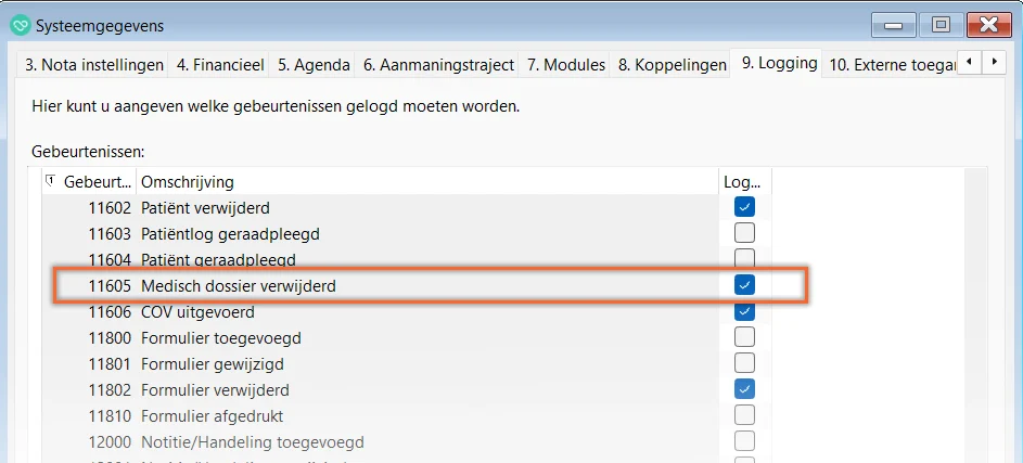 • Selecteer of het verwijderen van medische dossiers gelogd moet worden.