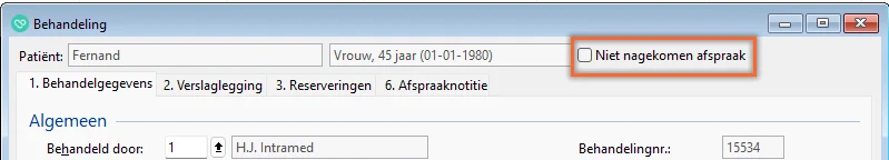 In de behandeling is rechts bovenin een aanvinkvakje toegevoegd: ‘Niet nagekomen afspraak’.
