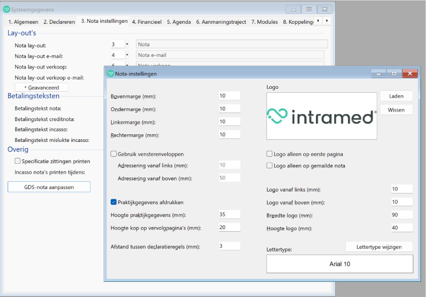 We hebben een aantal opties toegevoegd voor de GDS nota. Je vindt vanaf deze versie deze opties in Intramed onder Systeem -> Organisatie -> Systeemgegevens -> Nota-instellen en dan de knop GDS nota aanpassen