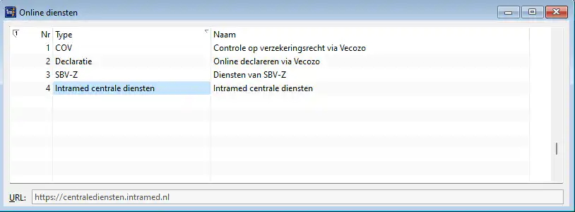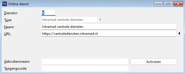 Nu gaan we de Online diensten activeren. Ga naar menu ‘Systeem’-‘Organisatie’,‘Online diensten’. Dubbelklik op ‘Intramed centrale diensten’.