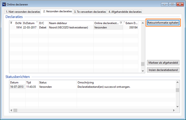 Als er nog geen retourinformatie beschikbaar is voor een declaratie, blijft deze staan op tabblad “2. Verzonden declaraties”. Voor alle overgebleven declaraties op tabblad “2. Verzonden declaraties” kun je later nog een keer de retourinformatie opvragen.