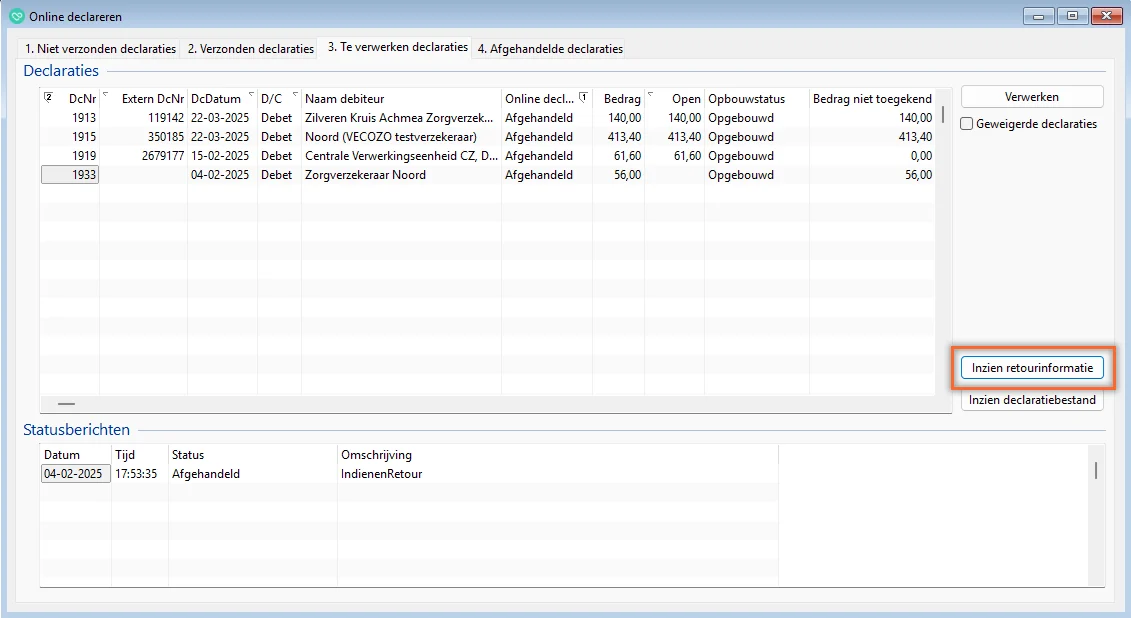 4. Je kunt de retourinformatie openen door te dubbelklikken op de declaratie in het scherm “Retourinformatie”, of via tabblad “3. Afgehandelde declaraties”. Sluit het scherm (“ESC” of ).