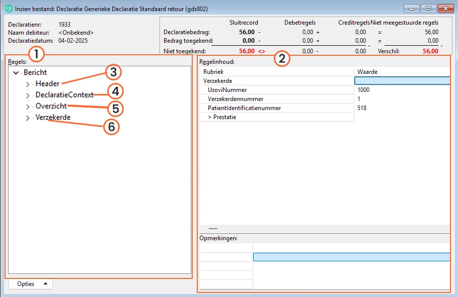 Header (3): hier vind je informatie over het declaratiebericht. Bijvoorbeeld wie de ontvanger is, op welke datum het bericht verzonden is en wie de ontvanger is. Ook vind je hier het referentienummer.