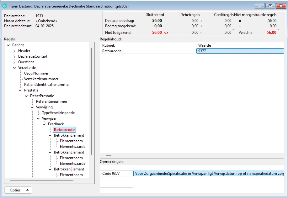 In dit scherm kun je zien waarom een record is afgekeurd door de verzekeraar. Kijk in het bericht en zoek naar de rood gemarkeerde records en klik daarop. Bekijk bij “opmerkingen” waarom het record is afgekeurd.
